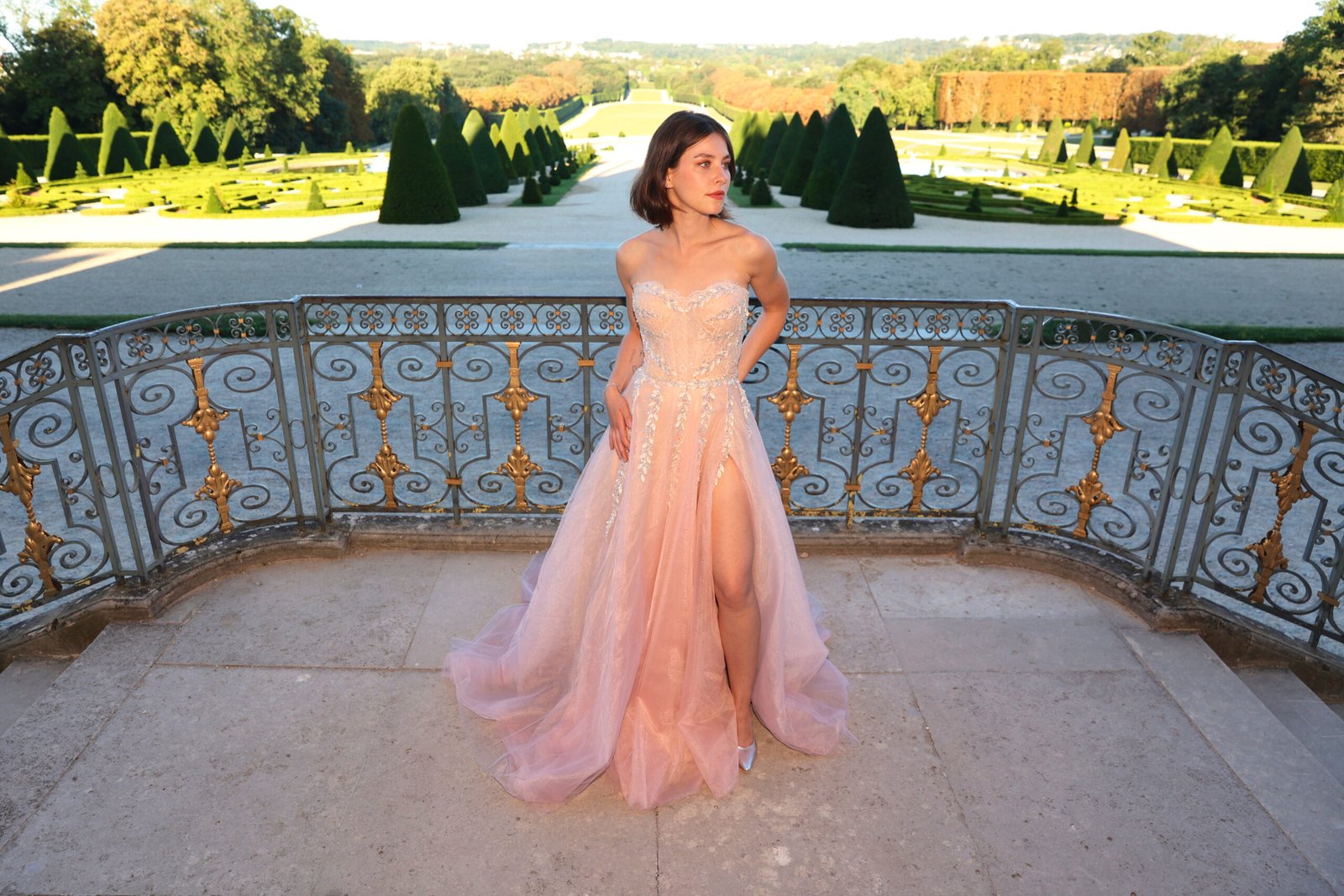 Robe de soirée longue en guipure rose poudrée avec pierres décoratives.